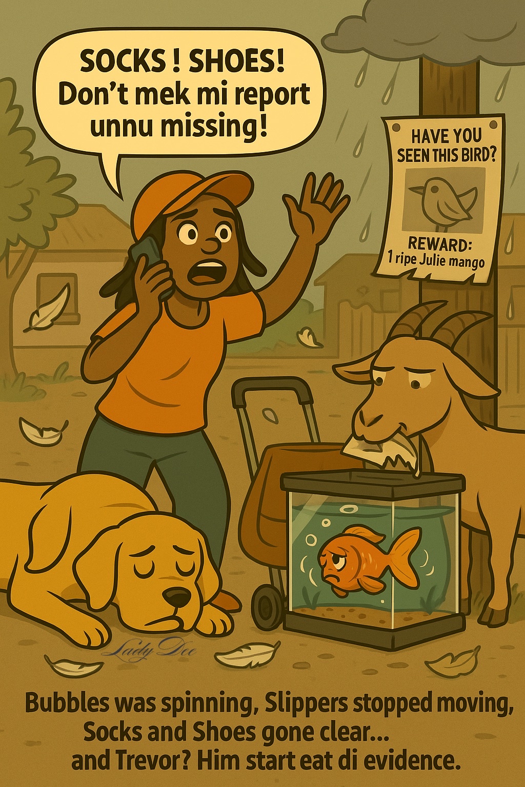 “Mi see two yellow bird fly toward di breadfruit tree earlier… one a dem bawling, di next one flapping like him vex.”