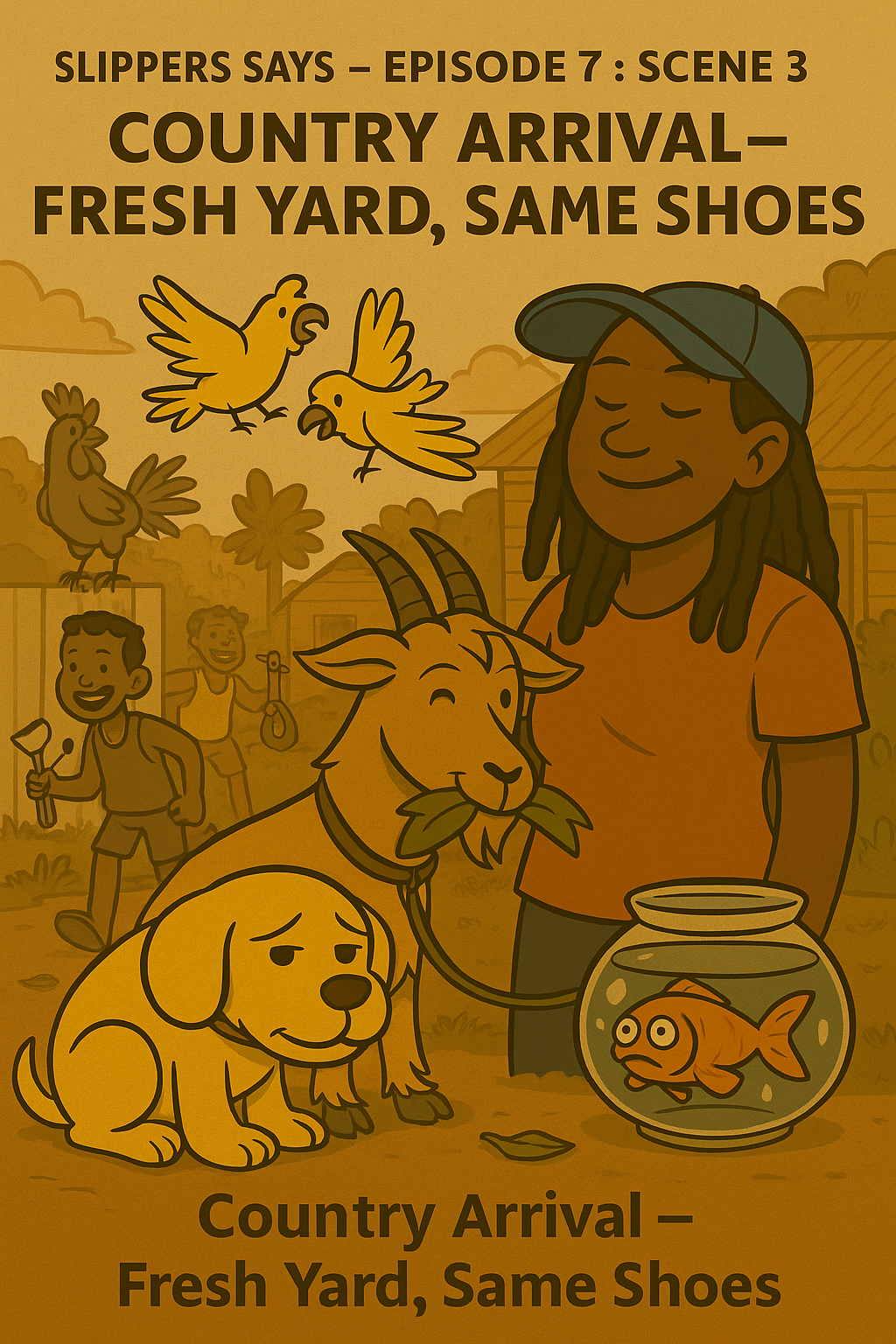 Mi belly still tight from that country bus ride. Mi paw dem sore, mi ear full of horn noise, and mi spirit? Barely holding on. All now mi cyaan believe Lady Dee put leash pon Trevor and not mi — and mi name Slippers!