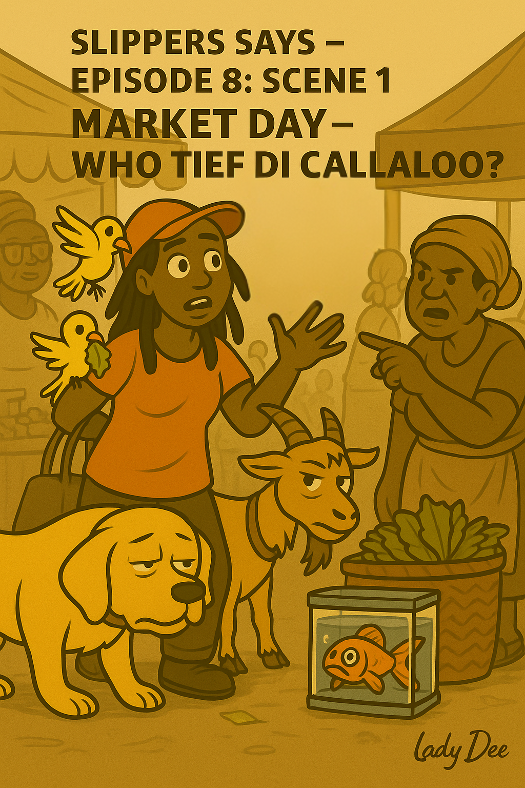 By di time we reach market, sun hot like it vex wid everybody. Stall deh left, right, centre — mango, ackee, yam, bush medicine, and one man selling nothing but empty bottles and pure argument. Lady Dee walk proud through di crowd, checking prices, greeting vendors, and sniffing dasheen like she born in a soil bucket. Mi trod behind, tongue hanging out, trying fi keep Trevor in line — but him keep pulling toward a sugarcane cart like it calling him by name.